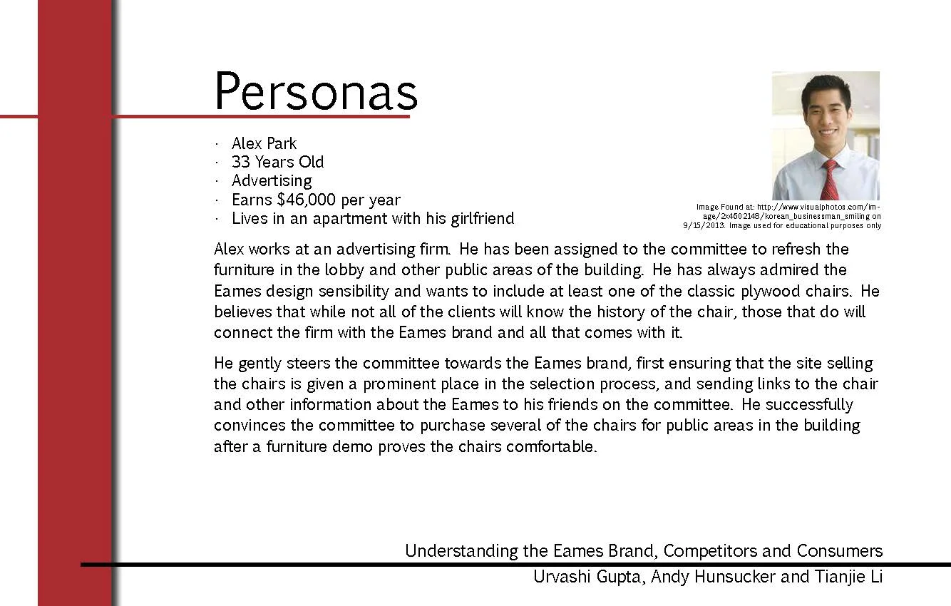 Based on these personas, we sketched out potential single page user experiences for our users. We each came up with individual ideas for how different pages would look. My contribution was a feature where users could upload a picture of their own living room, and then place Eames furniture in their own spaces.